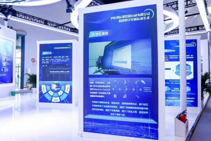 在年度主题展区中远海运集团展位,重点展出了航运业首个区块链联盟(GSBN)、5G智慧港口、智慧关务平台“远海通”、船视宝等航运科技、物流以及港口等领域的前沿科技成果。其中,航运业首个区块链联盟(GSBN)由8家全球知名航运与港口公司联合创建。2021年7月21日,首个应用产品“无纸化放货”在中国正式上线,通过该方案,进口货物办理完成单证手续的时间从24—48小时缩短到4个小时以内。