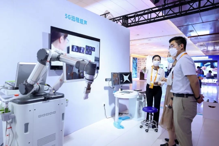 在国家会议中心通用技术集团展位,酷炫的5G远程超声机械臂,引来不少参观者问询。“依托5G网络,可以还原超声专家的手法在柔性臂上,远程对患者进行超声诊断检查。”工作人员介绍道。目前,5G远程超声项目已在十几个省份的基层单位实践应用,开展远程超声诊断一千多例,使基层患者获得更加规范的诊疗。