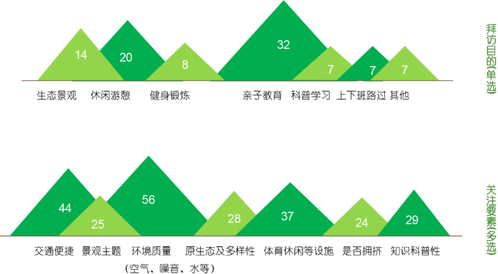 根据问卷调查显示,市民对公园的访问目的,除生态和景观之外,更加关注的是亲子、生境品质、科普、锻炼、休闲等功能,促进身心放松、心理减压等。在关注要素上,除传统的交通便捷外,愈发关注空气、噪音、是否拥挤等环境质量,以及知识性等要素。对于城市公园的需求,除常规生态和景观功能,市民需要更多获得感、动态和交互的体验。