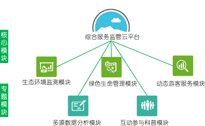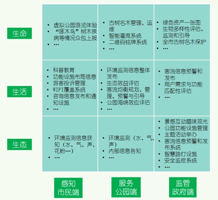 核心框架主要包括以下内容:生态环境监测模块、绿色生命管理模块、动态游客服务模块、共享互动科普模块,以及多源数据分析模块。在核心功能下,针对不同类型公园和管理要求的弹性配置,采用分权限管理平台和模块化组合的框架结构;相应模块则按照生态、生活、生命和市民、公园和政府两个维度的功能目标归类,形成相应场景矩阵。