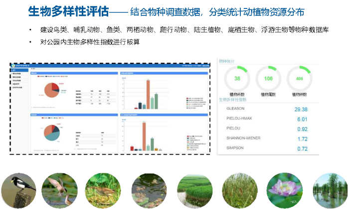 针对日益增长的绿色资产保护与管理趋势,联动规划、绿化、环保部门数据,结合古树名木、物种调查建设鸟类、哺乳动物、鱼类、两栖动物、爬行动物、陆生植物、底栖生物、浮游生物等物种数据库,基于动植物资源的空间位置分布形成生境地图,分类统计动植物资源,对公园内生物多样性、碳汇等指标进行监测、核算。
