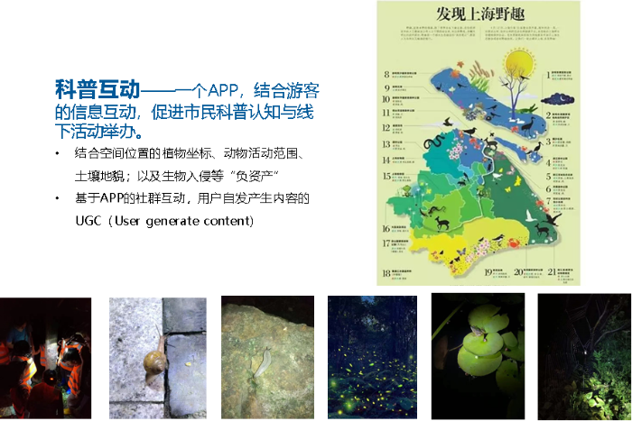针对市民需求不断增长的科教文化需求,设置景点、设施、装置、物种二维码系统;结合空间位置的植物坐标,介绍动植物特性、动物活动范围、土壤、地貌、生物入侵等科普知识,通过移动终端提供信息互动,丰富游客与市民对生命的感知;结合不断丰富的身体锻炼、多人游戏、行为感应等互动装置的主动健康智慧运动共享空间,介绍使用方法、根据许可为市民提供实时运动信息,引导健康生活;并可按照UGC(User Generate Content)用户分享内容的方式,促进市民科普认知与线下活动举办。