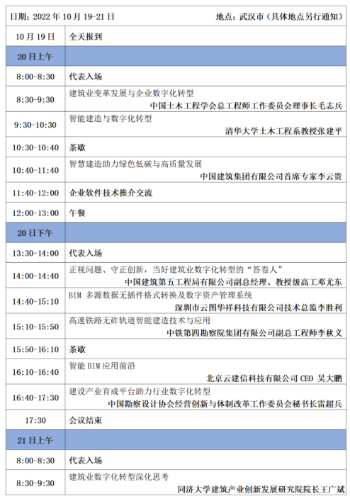 时间:2022年10月19-21日,19日全天报到,20、21日全天会议。具体安排请见后续通知或关注“智慧建造百人”微信公众号。