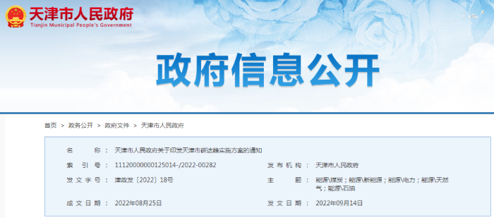 日前,天津市人民政府印发了《天津市碳达峰实施方案》,通知指出: