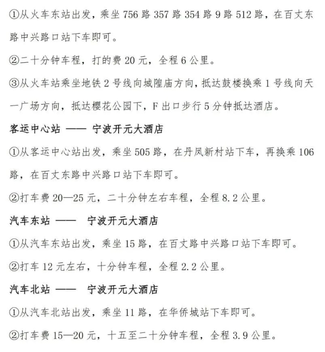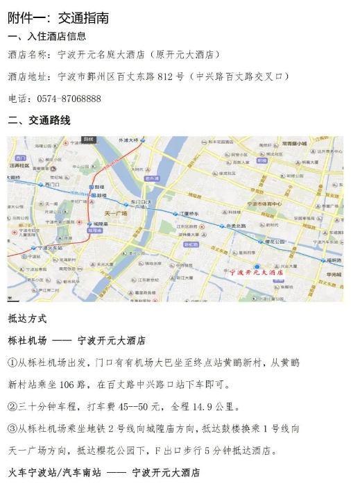 宁波开元名庭大酒店(原开元大酒店) (地址:宁波市鄞州区百丈东路812号,具体交通路线见附件一)