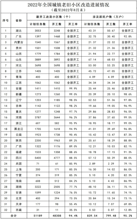 据住房和城乡建设部官网近日信息显示,2022年1-8月份,全国新开工改造城镇老旧小区4.83万个、799万户,按小区数计占年度目标任务的94.4%。其中,湖北、广东、内蒙古、贵州、山西、山东、河北、江苏、青海、江西等10个省份新开工改造城镇老旧小区数完成年度计划任务。