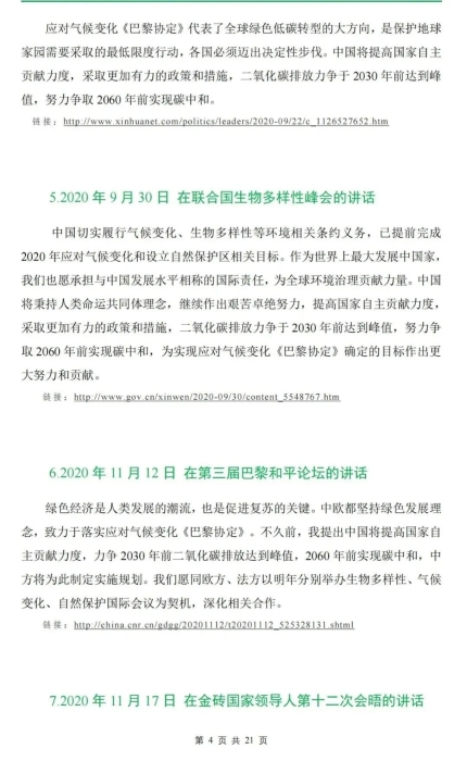 摘要:中国切实履行气候变化、生物多样性等环境相关条约义务,已提前完成2020年应对气候变化和设立自然保护区相关目标。作为世界上最大发展中国家,我们也愿承担与中国发展水平相称的国际责任,为全球环境治理贡献力量。中国将秉持人类命运共同体理念,继续作出艰苦卓绝努力,提高国家自主贡献力度,采取更加有力的政策和措施,二氧化碳排放力争于2030年前达到峰值,努力争取2060年前实现碳中和,为实现应对气候变化《巴黎协定》确定的目标作出更大努力和贡献。