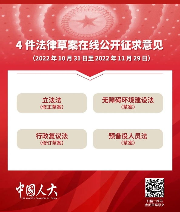 今天起,4件法律草案公开征求意见,截止日期为2022年11月29日。