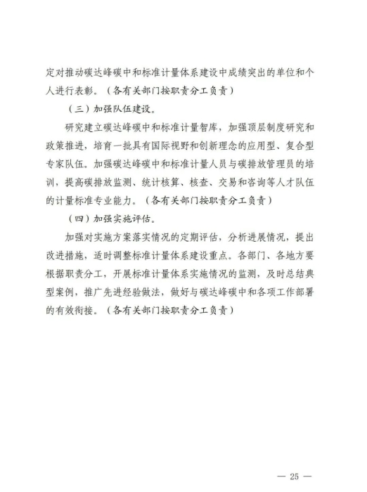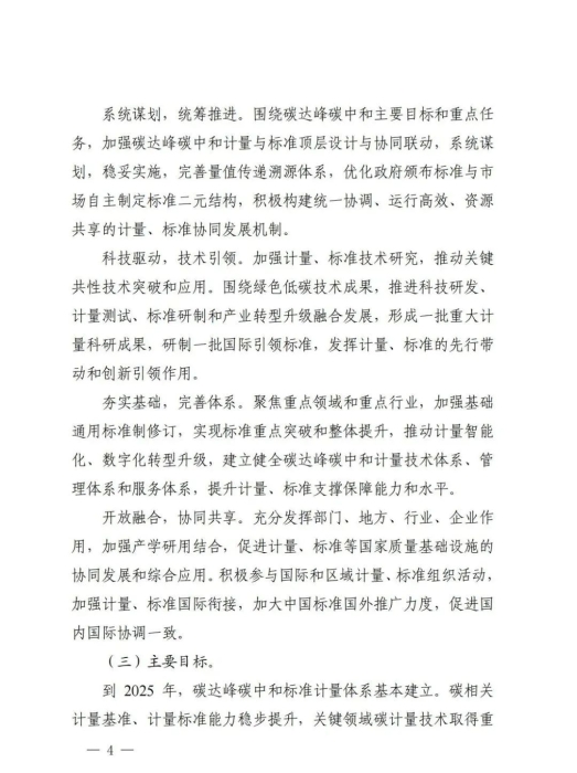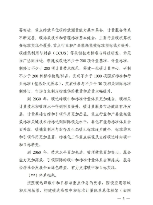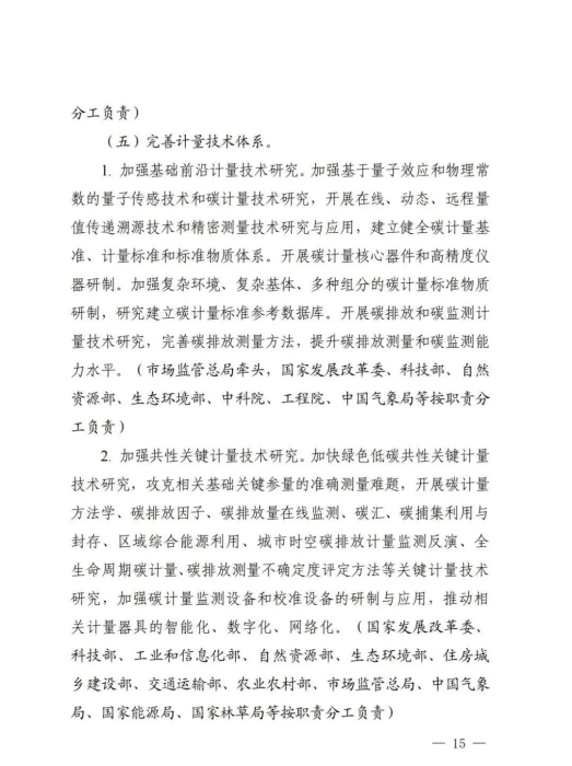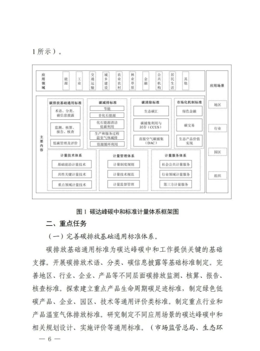 《实施方案》围绕建立完善碳达峰碳中和标准计量体系,提出了完善碳排放基础通用标准体系、加强重点领域碳减排标准体系建设、加快布局碳清除标准体系、健全市场化机制标准体系、完善计量技术体系、加强计量管理体系建设、健全计量服务体系7个方面的24项重点任务,明确了实施碳计量科技创新工程、碳计量基础能力提升工程、碳计量标杆引领工程、碳计量精准服务工程、碳计量国际交流合作工程5项重点工程,开展双碳标准强基行动、百项节能降碳标准提升行动、低碳前沿技术标准引领行动、绿色低碳标准国际合作行动4项重点行动,并对协调推动各项工作落实提出相应要求。