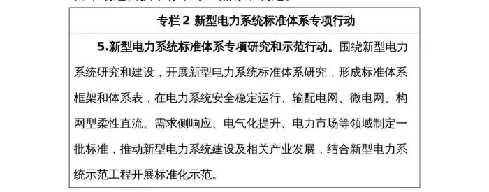 ——建立完善以光伏、风电为主的可再生能源标准体系,研究建立支撑新型电力系统建设的标准体系,加快完善新型储能标准体系,有力支撑大型风电光伏基地、分布式能源等开发建设、并网运行和消纳利用。
