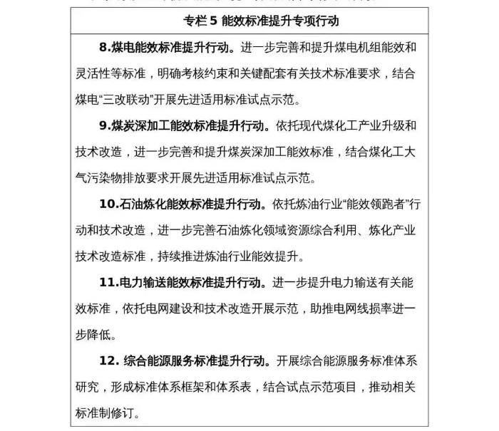 ——修订一批常规能源生产转化和输送利用能效相关标准,提升标准要求和水平,助推和规范资源综合利用、能效提升。