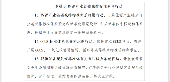 围绕能源领域二氧化碳捕集利用与封存(CCUS)有关技术研发和项目建设需求,加快推进相关标准管理体系和标准体系完善,推进二氧化碳捕集、输送、封存监测、泄漏预警、驱油等关键环节标准制修订。