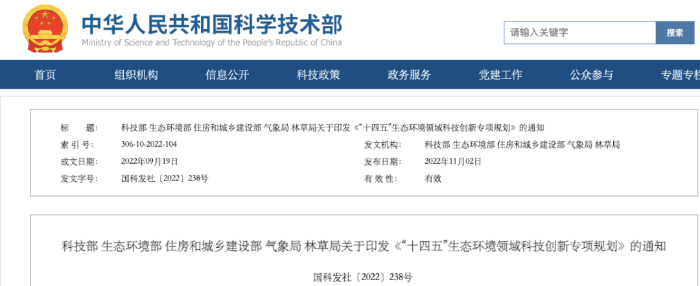 针对我国主要生态环境问题与重大科技需求,依据《中华人民共和国国民经济和社会发展第十四个五年规划和2035年远景目标纲要》,科技部、生态环境部、住房和城乡建设部、气象局、林草局编制了《“十四五”生态环境领域科技创新专项规划》。现印发给你们,请结合各地区各部门实际,认真贯彻落实。