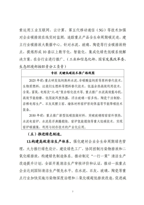 《实施方案》指出,在水泥、石灰、玻璃、陶瓷等重点行业加快实施污染物深度治理和二氧化碳超低排放改造,促进减污降碳协同增效,到2030年改造建设1000条绿色低碳生产线。