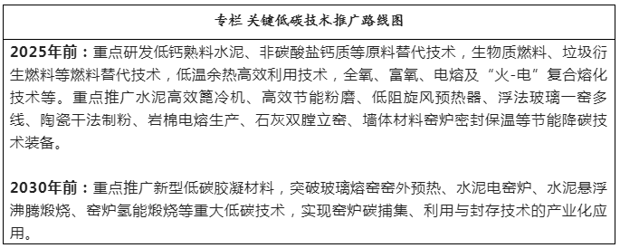 11.加快推广节能降碳技术装备。每年遴选公布一批节能低碳建材技术和装备,到2030年累计推广超过100项。水泥行业加快推广低阻旋风预热器、高效烧成、高效篦冷机、高效节能粉磨等节能技术装备,玻璃行业加快推广浮法玻璃一窑多线等技术,陶瓷行业加快推广干法制粉工艺及装备,岩棉行业加快推广电熔生产工艺及技术装备,石灰行业加快推广双膛立窑、预热器等节能技术装备,墙体材料行业加快推广窑炉密封保温节能技术装备,提高砖瓦窑炉装备水平。(工业和信息化部、国家发展改革委按职责分工负责)