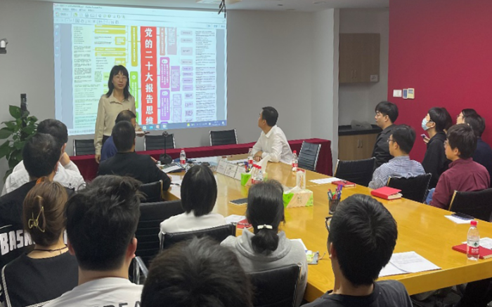 华森公司杭州分公司党支部书记郑乐乐领学党的二十大报告中的新表述、新论断,结合工作实际对报告内容进行了深入浅出的讲解。她号召全体党员干部深刻领悟党的二十大报告关于党和国家事业发展大政方针和战略部署的历史逻辑、理论逻辑、实践逻辑,用习近平新时代中国特色社会主义思想武装头脑、指导实践、推动工作,全面加强企业新业务模块改革推进工作,提质增效优化人员配置,以实际行动推动分公司高质量发展。