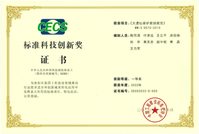 中国建科所属中国建筑设计研究院有限公司申报的《大遗址保护规划规范》(WW/Z0072-2015)荣获 “标准科技创新奖”项目一等奖。