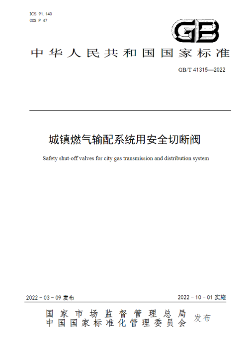 项目简介:《城镇燃气输配系统用安全切断阀》国家标准是针对我国燃气输配系统用安全切断阀无标准的现状而制订的,是我国燃气安全切断阀产品的首部国家标准,使我国成为除欧盟外,全世界第二个制订压力为10.0MPa燃气安全切断阀标准的国家/地区,填补了国际国内空白,提升了我国标准的先进性,经国家标准审查组专家鉴定一致认为达到了国际先进水平。本标准规定了城镇燃气输配系统用的燃气安全切断阀的分类、代号和型号、结构和材料、试验方法、检验规则、质量证明文件等内容。燃气安全切断阀产品广泛应用于西气东输四线、川气东送、陕京线、中俄东线、煤改气工程等国家重大项目,支撑西气东输、蓝天工程、新型城镇化、乡村振兴等国家战略工程,保障了安全供气,为我国环境空气质量改善作出了积极贡献,社会环境效益显著。本标准的实施将有力促进燃气安全切断阀行业发展,保障我国燃气输配系统安全,保持我国在该领域的技术先进性和国际领先地位。