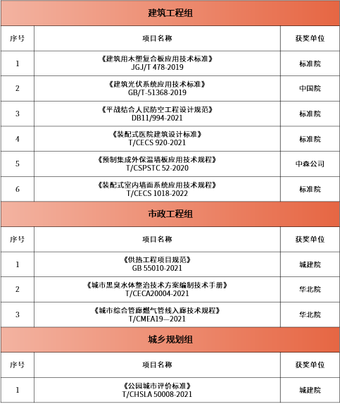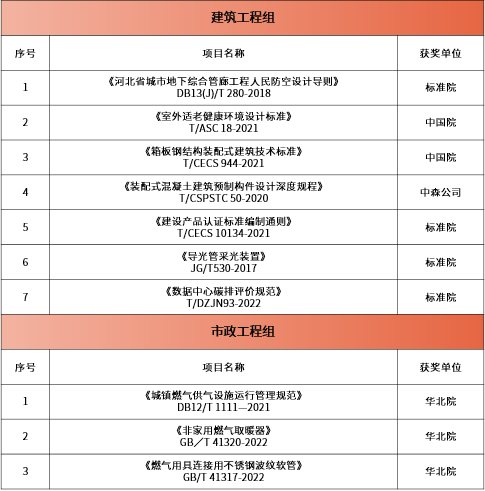 日前,中国建设科技集团(简称中国建科)发布《关于表彰2022年度集团科技进步奖、标准创新奖和优秀工程设计奖获奖项目的通知》,2022年度标准创新奖获奖项目共23项。其中:建筑工程组获奖14项,包括一等奖1项、二等奖6项、三等奖7项;市政工程组获奖8项,包括一等奖2项、二等奖3项、三等奖3项;城乡规划组获奖1项,包括二等奖1项。
