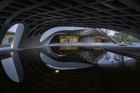 主要技术特点:文化中心各个功能体既相互依存,又流线分明,不同的建筑功能形体采用曲线语言统一建筑群,并且与绿化和水系交织融合为一体。建筑与景观采用了江南水乡的营造手法,绿化、水系与主体建筑互相穿插渗透,结合屋顶水池、地面水系、老石桥和废弃砖瓦铺装地面,营造出江南水乡的韵味。建筑营造无柱空间,将楼梯、电梯等功能性的筒向上张开作为结构支承构件;水平构件采用现浇密肋梁体系,可有效解决超大悬挑和超大跨度梁高问题。这些理性结构构件以清水混凝土效果展现,形成凝固的建筑美学空间。