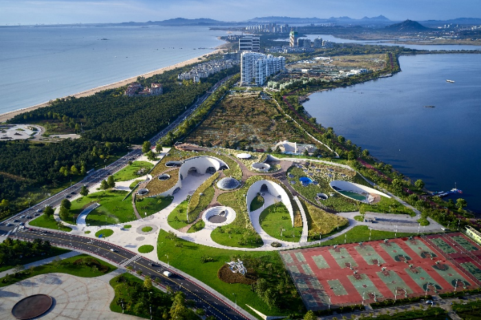 主要技术特点:项目采用多项绿建和海绵城市策略,并充分利用沿海面的景观,将公园的“玩”和购物的“逛”结合在一起,通过和公园相接的能到达各层商业的坡道,将人流引入商业。滨海欢乐园和滨海集乐园均为超长建筑,采用预应力地下室侧墙和膨胀加强带,避免结构设缝。为实现各单体“水滴”体块的层层扭转及经斜坡上至屋顶花园且联通各层商业等造型上的特点,采用了梁抬柱、大跨度悬挑梁、型钢梁、跃层柱、单柱连桥等多种技术措施。