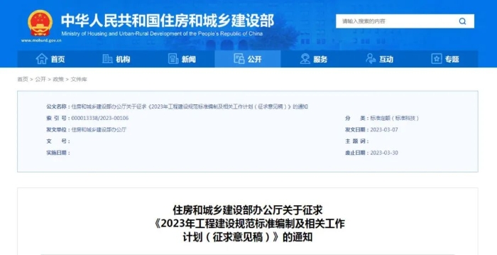 按照《国家标准化发展纲要》部署和工程建设标准化改革要求,为满足工程建设需要,完善新型工程建设标准体系,近日,住房和城乡建设部就《2023年工程建设规范标准编制及相关工作计划》向社会公开征求意见。意见反馈截止时间为2023年3月30日。