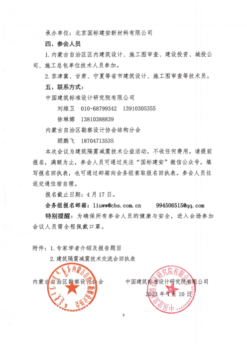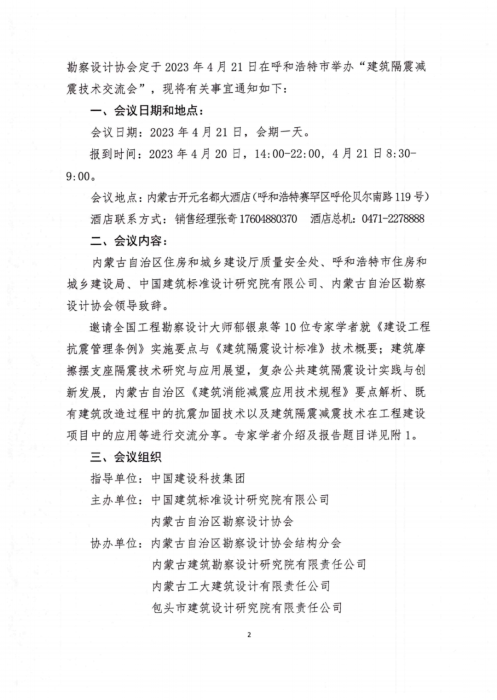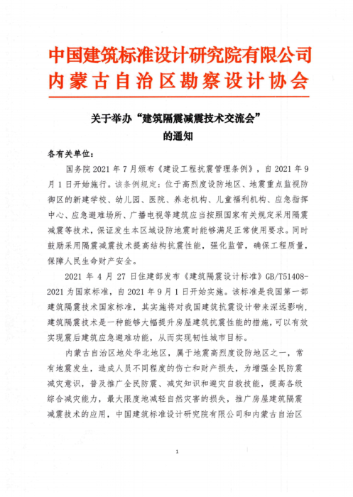 内蒙古自治区地处华北地区,属于地震高烈度设防地区之一,常有地震发生,造成人员不同程度的伤亡和财产损失,为增强全民防震减灾意识,普及推广全民防震、减灾知识和避灾自救技能,提高各级综合减灾能力,最大限度地减轻自然灾害的损失,推广房屋建筑隔震减震技术的应用,中国建筑标准设计研究院有限公司和内蒙古自治区勘察设计协会定于2023年4月21日在呼和浩特市举办“建筑隔震减震技术交流会”。