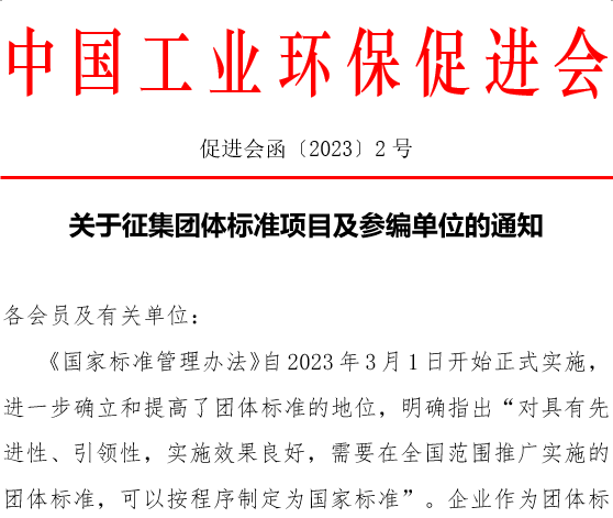 为积极配合相关单位开展标准化工作,促进我国制造业绿色高质量发展,响应国家“双碳”战略,依据《中国工业环保促进会团体标准管理办法》规定,现开展2023年团体标准制订项目及参编单位征集工作,请贵单位积极参与。