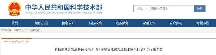 科技部社会发展科技司关于《国家绿色低碳先进技术成果目录》公示的公告