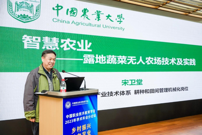 宋卫堂做题为《智慧农业——露地蔬菜无人农场技术及实践》的报告。报告深刻诠释了智慧农业的本质内涵和主要特征,介绍了智慧农业相对于传统农业的优势,阐述了发展智慧农业的必要性,并以蔬菜无人农场为例,从技术模式、管理平台、关键技术、农机农具等方面介绍了无人农场生产管理模式,展示了无人驾驶、耕地、起垅、移栽、采收、植保、巡检作业等农场实践,全方位展现了5G、农业物联网、农业遥感、农业大数据分析决策、智能农机、农业机器人等现代信息技术装备对传统涉农专业的升级改造。