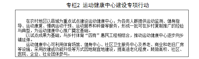 (七)深入开展运动促进健康行动。广泛开展“体育进乡村,运动促健康”科普活动和“健康中国 母亲行动”,提升农民体育健康素养。加强乡村医生科学健身指导能力和体卫融合技能培训。推动体卫融合服务机构向乡村覆盖延伸,支持乡村医疗卫生机构提供科学健身指导服务。实施运动健康中心建设工程,以改扩建为主要方式建立一批运动健康中心,推动建立体育和卫生健康等部门协同、全社会共同参与的运动促进健康新模式。优化国民体质监测和科学健身指导服务,研究完善适合农民的运动项目库、健身指导方案和健身活动指南。充分发挥体育的健康促进作用,促进乡村学龄儿童和老年人身心健康。研究推广适合老年人的体育健身休闲项目、方式和方法,发挥运动在老年人慢性病防控中的积极作用,发布老年人体育健身活动指南。