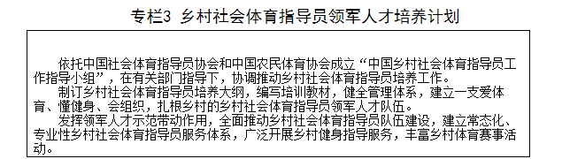 (十一)加强乡村体育人才队伍建设。建立健全乡村社会体育指导员培训体系和工作机制。各级社会体育指导员的考核认定工作向回乡创业大学生、乡村体育教师等各类体育人才倾斜。建立乡村体育人才信息数据库。加大乡村社会体育指导员领军人才和乡村体育骨干人才培养。开展体育专业院校毕业生基层成长计划、体育人才下乡支教等专项活动,引导体育专门人才更好地在农村就业创业。建立人才激励机制,定期在全国群众体育先进表彰中推选乡村体育工作先进典型,增强乡村体育工作者的荣誉感和责任感。