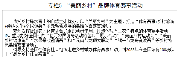 (十五)打造特色体育赛事活动。打造“三农”特色鲜明、传统文化底蕴深厚、社会影响力大、可持续性强的乡村体育综合赛事活动。在全国运动会、全国少数民族传统体育运动会等全国综合性运动会项目设置、活动策划、宣传报道等方面强化乡村振兴有关工作。在中国农民丰收节、全国乡村振兴职业技能大赛中增设体育健身内容。办好全国农民体育健身大赛、全国乡(村)长体育健身大赛等赛事活动。推动乡村体育赛事国际交流,鼓励有条件的地方以乡村为比赛地点,举办国际龙狮争霸赛、国际龙舟赛、国际风筝节、国际登山节等品牌体育赛事。