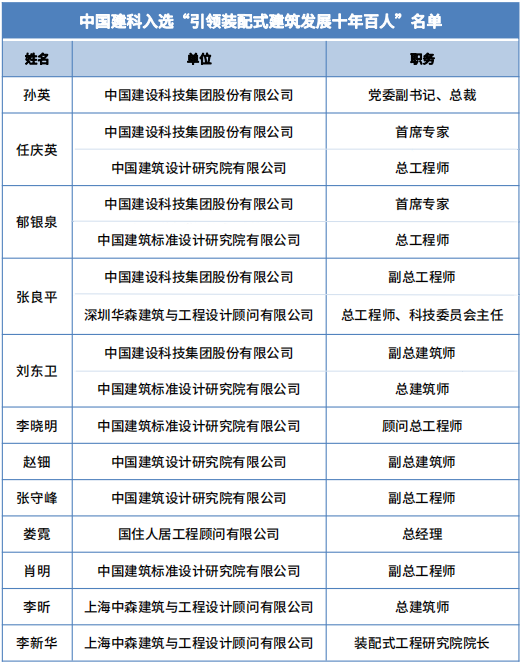 会上,住房和城乡建设部总工程师李如生为“引领装配式建筑十年百人”代表颁发入选证书。中国建科共有12人从200余位候选人中成功入选“引领装配式建筑发展十年百人”,所属中国建筑设计研究院有限公司、中国建筑标准设计研究院有限公司、深圳华森建筑与工程设计顾问有限公司、上海中森建筑设计与工程顾问有限公司四家企业成功入选“装配式建筑领军企业巡礼”。中国建科是个人入选最多、企业入选最多的单位,全面彰显集团引领装配式建筑发展的科技实力。