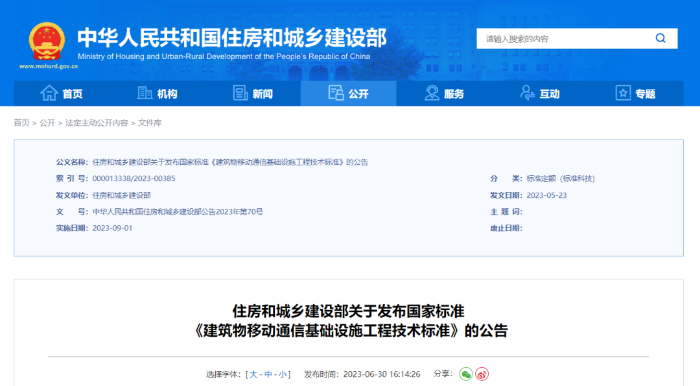 近日,住房和城乡建设部发布《建筑物移动通信基础设施工程技术标准》《工业设备及管道防腐蚀工程技术标准》2项国家标准,均自2023年9月1日起实施。