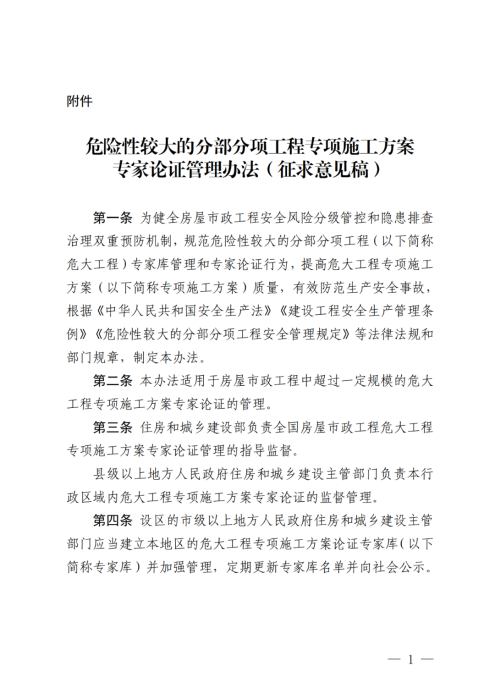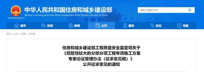 为健全房屋市政工程安全风险分级管控和隐患排查治理双重预防机制,有效防范房屋市政工程生产安全事故,住房城乡建设部工程质量安全监管司组织起草了《危险性较大的分部分项工程专项施工方案专家论证管理办法》,现向社会公开征求意见。