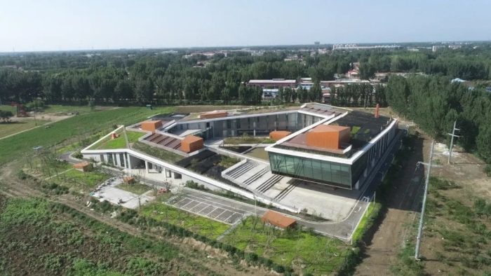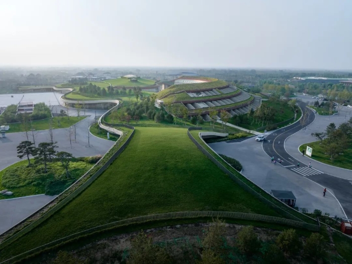 该场馆既是一处大型游客接待设施,也兼具展示雄安绿化建设成就的功能。建筑整体覆盖在坡地以下,遵从绿⾊低碳的发展理念,减少了对公园景⾊的⼲扰和堆⼭所需的⼟⽅量,也使得建筑具有优异的热⼯性能。