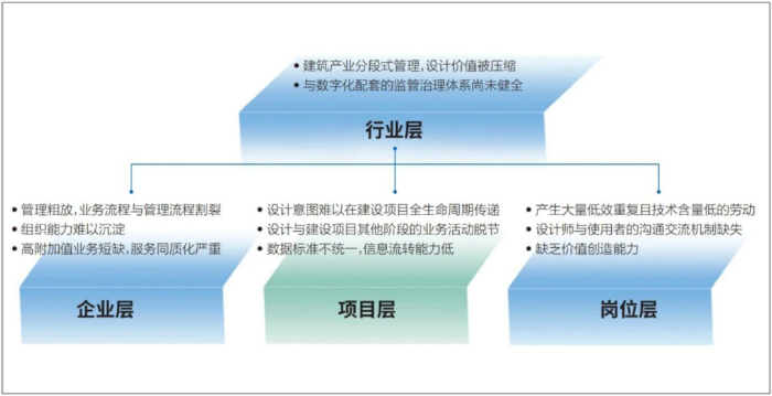 长期以来,设计作业只能以分散的、孤立的方式开展。组织内各专业间信息无法及时调用,变更的信息不能实施同步;组织外业主的需求难以传达,多方信息难以共享等,产生大量低效重复且技术含量低的劳动。设计师疲于完成一个又一个的项目设计,只能聚焦工作职责范围内的一亩三分地,长期处在单一的工作阶段。同时,由于设计师与使用者的沟通交流逐步弱化,也没有大数据分析等需求挖掘的方式和技术,以致设计师只能对客户基本需求进行思考和探究,缺少与客户情感上的共鸣和全过程价值创造意识,也缺乏创新思维的实践机会。没有时间和空间思考如何提升全过程价值创造的能力,久而久之,不仅不利于设计在建筑项目中发挥应有价值,也限制设计师自身的发展,影响行业进步的步伐。