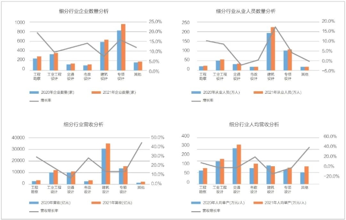 设计师的价值创造能力与其创造的营收成正比。《工程勘察设计行业年度发展研究报告(2022)》中数据显示,建筑设计及专项设计类企业和从业人员数量最多、营收规模最大,但人均产值较低,处在中下游水平,而且建筑设计类人均单产出现负增长。