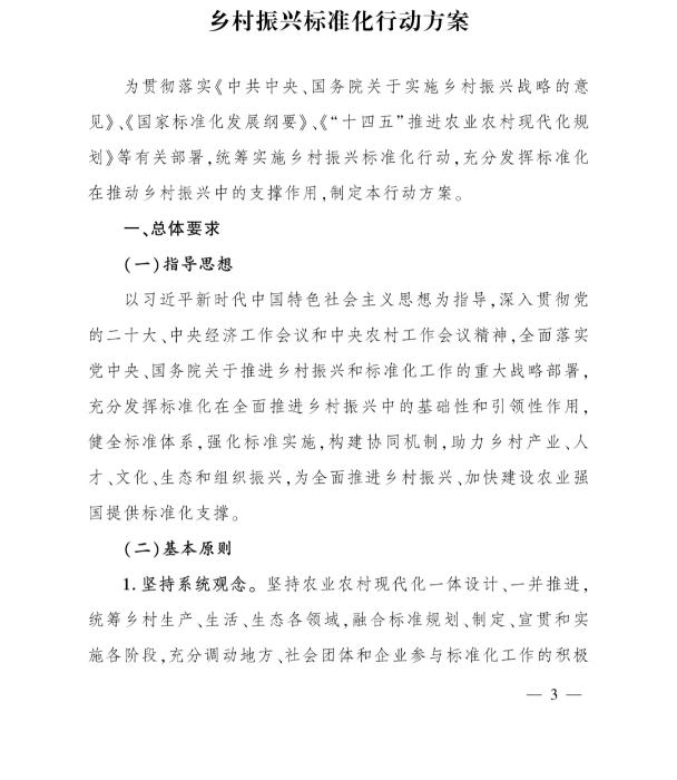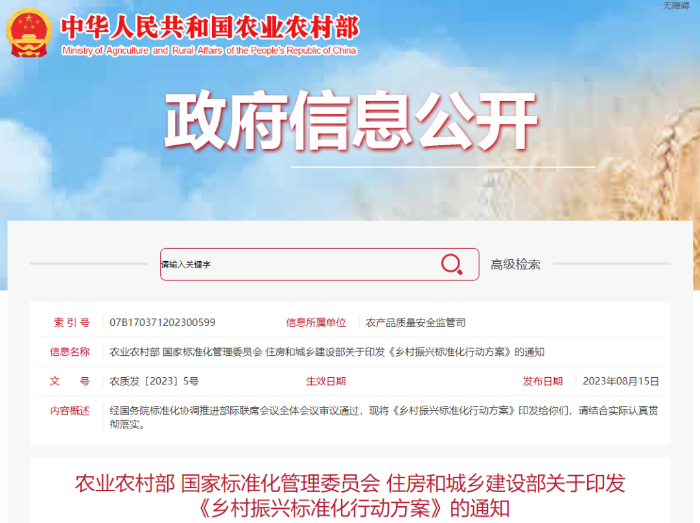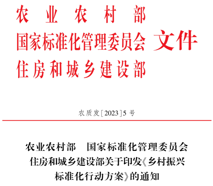 为充分发挥标准化在全面推进乡村振兴中的基础性和引领性作用,近日,农业农村部、国家标准委、住房城乡建设部联合印发《乡村振兴标准化行动方案》(以下简称《方案》)。《方案》经国务院标准化协调推进部际联席会议审议通过,共有33个部门参与实施。