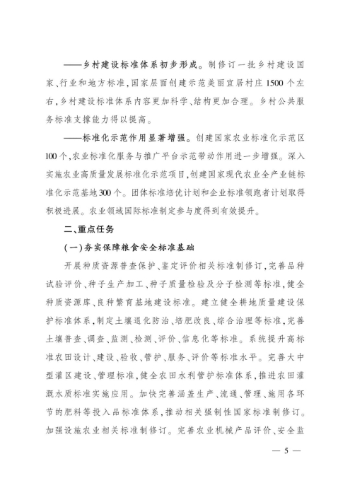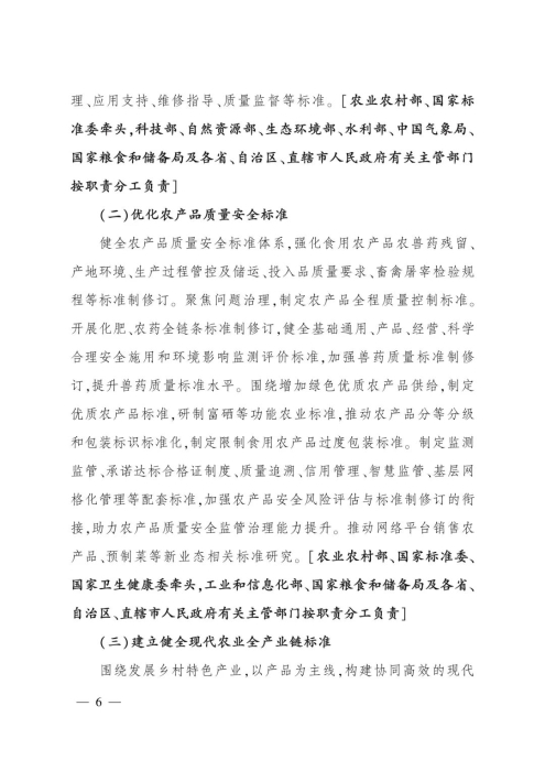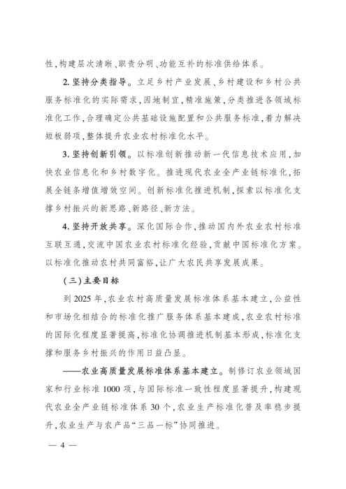 《方案》明确主要目标:到2025年,农业农村高质量发展标准体系基本建立,公益性和市场化相结合的标准化推广服务体系基本建成,农业农村标准的国际化程度显著提高,标准化协调推进机制基本形成,标准化支撑和服务乡村振兴的作用日益凸显。农业高质量发展标准体系基本建立。制修订农业领域国家和行业标准1000项,与国际标准一致性程度显著提升,构建现代农业全产业链标准体系30个;乡村建设标准体系初步形成。制修订一批乡村建设国家、行业和地方标准,国家层面创建示范美丽宜居村庄1500个左右;标准化示范作用显著增强。创建国家农业标准化示范区100个,农业标准化服务与推广平台示范带动作用进一步增强。深入实施农业高质量发展标准化示范项目,创建国家现代农业全产业链标准化示范基地300个。