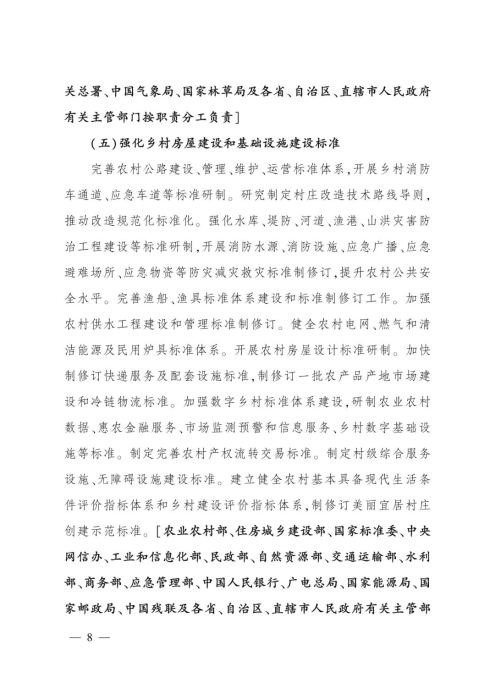 强化乡村房屋建设和基础设施建设标准。完善农村公路建设、管理、维护、运营标准体系,开展乡村消防车通道、应急车道等标准研制。研究制定村庄改造技术路线导则,推动改造规范化标准化。强化水库、堤防、河道、渔港、山洪灾害防治工程建设等标准研制,开展消防水源、消防设施、应急广播、应急避难场所、应急物资等防灾减灾救灾标准制修订,提升农村公共安全水平。完善渔船、渔具标准体系建设和标准制修订工作。加强农村供水工程建设和管理标准制修订。健全农村电网、燃气和清洁能源及民用炉具标准体系。开展农村房屋设计标准研制。加快制修订快递服务及配套设施标准,制修订一批农产品产地市场建设和冷链物流标准。加强数字乡村标准体系建设,研制农业农村数据、惠农金融服务、市场监测预警和信息服务、乡村数字基础设施等标准。制定完善农村产权流转交易标准。制定村级综合服务设施、无障碍设施建设标准。建立健全农村基本具备现代生活条件评价指标体系和乡村建设评价指标体系,制修订美丽宜居村庄创建示范标准。