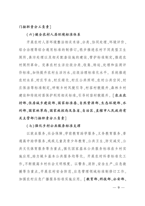 健全农村人居环境标准体系。开展农村人居环境整治相关术语、分类、协同处理、环境评价、综合治理等综合通用标准的制修订,稳步推进农村不同类型卫生厕所、粪污处理以及相关配套设施的建设、管护标准制定,推进农村厕所革命。完善农村生活垃圾分类、收集、转运、处理和监测评价标准,加快提升农村生活污水、垃圾治理标准化水平。系统推进农村水系、村庄节水、村庄绿化、村庄公共照明、农村公共空间、村庄保洁等标准制定,研制乡村风貌引导、村容村貌提升、森林乡村建设和传统村落保护利用相关标准,引导村容村貌提升。