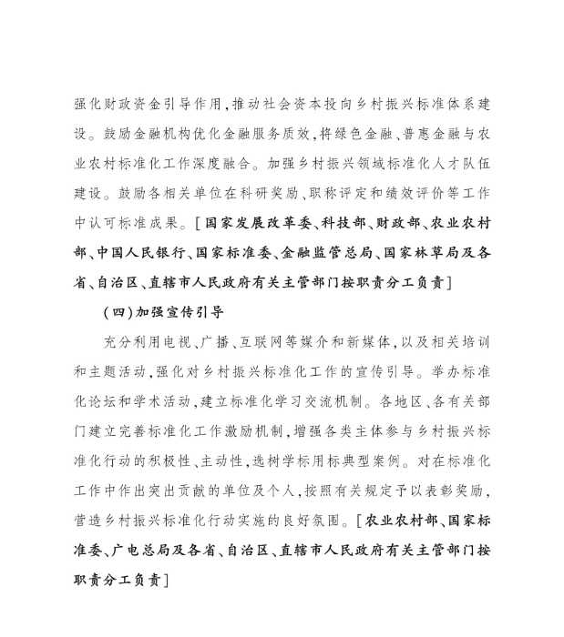 《方案》提出,国务院标准化协调推进部际联席会议统筹推进乡村振兴标准化行动,强化部门协同,上下联动,推动乡村振兴标准化行动有效落实。各地各有关部门在标准研制、实施应用、重要政策制定、重大问题协调等方面加强沟通协作,协同推进乡村振兴标准化工作。强化对事业单位、学会协会和标准化技术组织的指导,提高有关单位开展乡村振兴标准研制及应用推广能力。