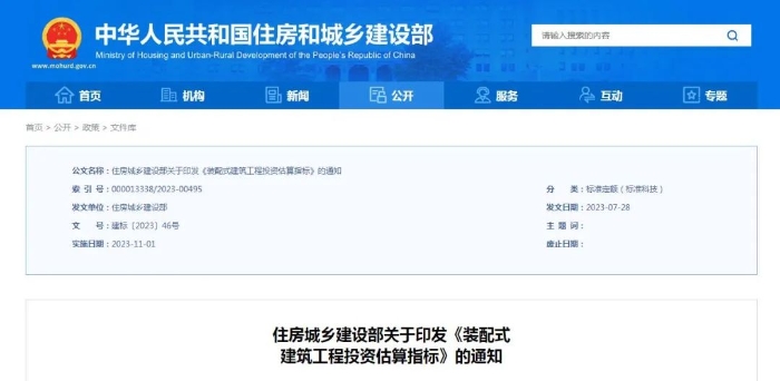 为推进装配式建筑发展,满足装配式建筑投资估算需要,住房城乡建设部组织编制了《装配式建筑工程投资估算指标》,自2023年11月1日起实施。