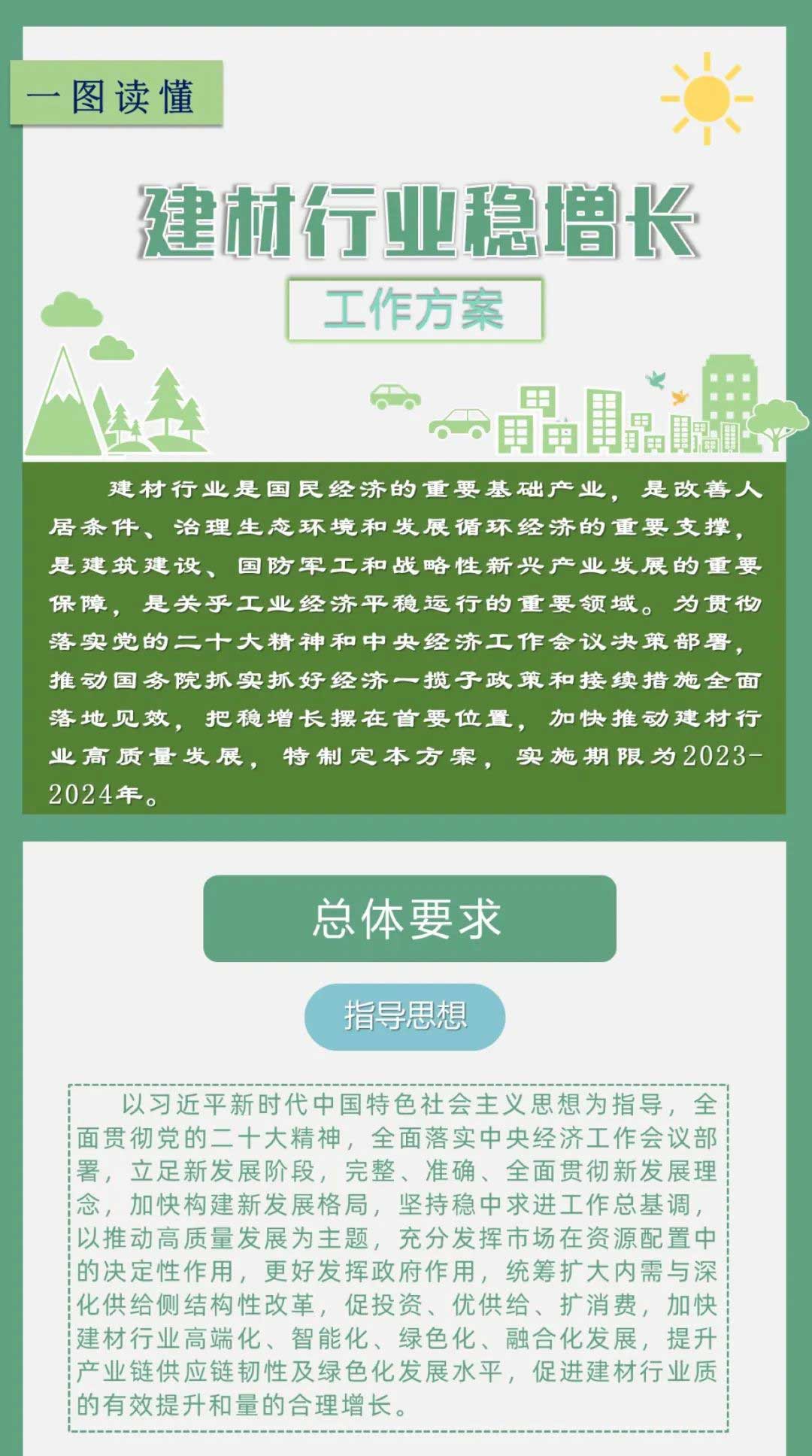 工业和信息化部、国家发展改革委、财政部、自然资源部、生态环境部、住房城乡建设部、商务部、金融监管总局等八部门近日联合印发《建材行业稳增长工作方案》,提出2023—2024年,建材行业稳增长的主要目标是:行业保持平稳增长,2023年和2024年,力争工业增加值增速分别为3.5%、4%左右。绿色建材、矿物功能材料、无机非金属新材料等规上企业营业收入年均增长10%以上,主要行业关键工序数控化率达到65%以上,水泥、玻璃、陶瓷行业能效标杆水平以上产能占比超过15%,产业高端化智能化绿色化水平不断提升。