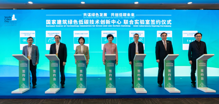 2023年10月29日,国创中心标识在2023年世界城市日专题论坛——建筑绿色低碳技术国际论坛正式发布。住房和城乡建设部标准定额司司长姚天玮,国创中心主任、中国建设科技集团股份有限公司(简称中国建科)总裁孙英,上海市住房和城乡建设管理委员会一级巡视员、副主任裴晓,C40城市气候领导联盟东亚区总监陈波平,中国绿发投资集团副总经理刘军,中国林业集团副总经理李留彬,中国节能环保集团副总经理李杰,中国建材集团总经理助理郅晓,清华大学建筑学院党委书记张悦,东南大学建筑学院院长张彤参加了标识发布仪式。发布仪式由住房和城乡建设部标准定额司国际科技合作处处长余山川主持。