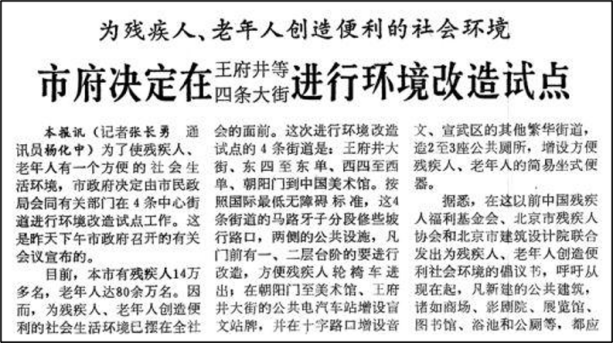 1985年3月,在“残疾人与社会环境研讨会”上,中国残疾人福利基金会、北京市残疾人协会、北京市建筑设计院联合发出了“为残疾人创造便利的生活环境”的倡议。北京市政府决定将西单至西四等四条街道作为无障碍改造试点。