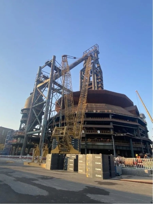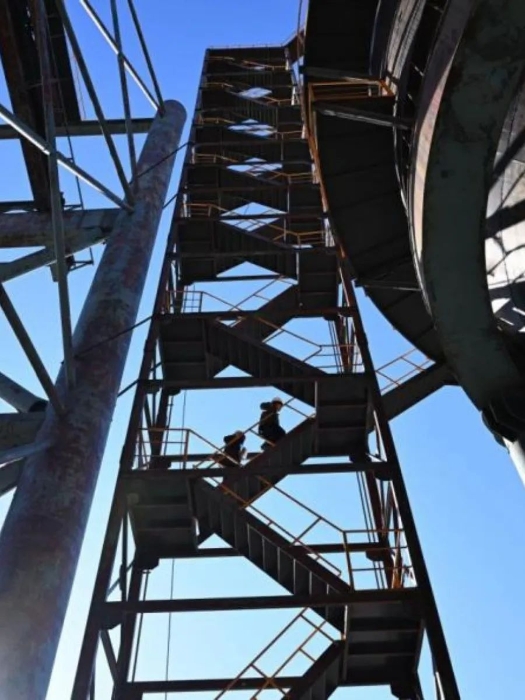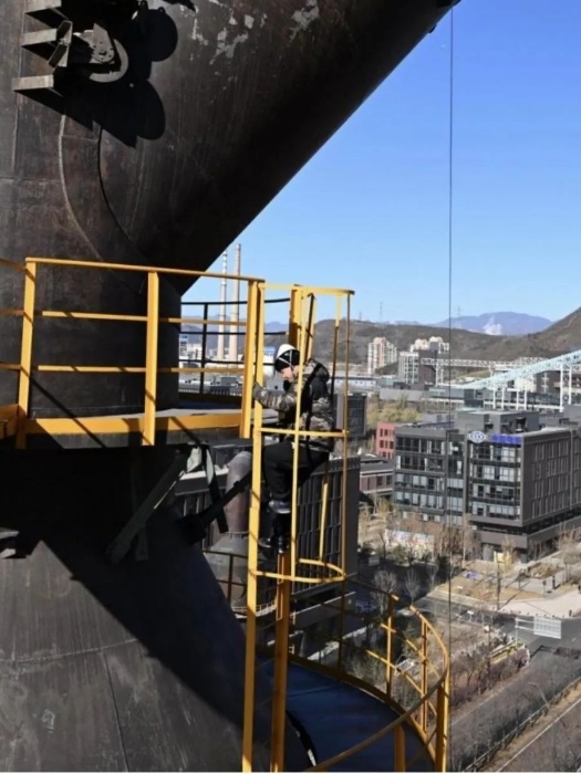 除了严寒带来的挑战,团队人员在工作中还需要克服对高空的恐惧。四高炉炉顶框架最高平台高程达107.92米,四面镂空的铁架楼梯更是让人心惊胆颤,连现场配合的工人都不敢上到最高平台。项目负责人武晓凤却沉着冷静、胆大心细,带头登顶,可谓 “巾帼不让须眉”。随着检测工作的开展,她与团队各成员上下高台十余次,动作娴熟、如履平地,令现场工人赞不绝口。