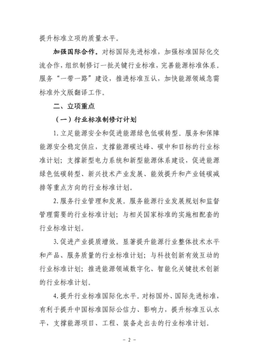 指南中明确提出立项工作要坚持需求导向,紧密围绕能源碳达峰碳中和目标任务,充分发挥标准推动能源绿色低碳转型、保障能源安全供应的技术支撑和引领性作用,突出重点领域和关键技术要求,提出能源行业标准计划。